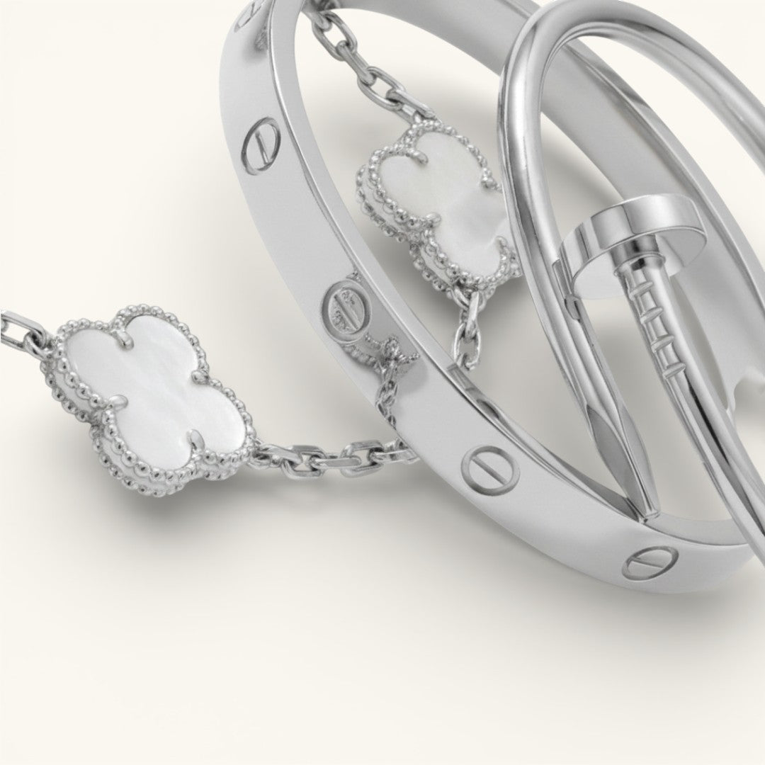 • Trinity & Clover Bracelet: A delicate and adjustable bracelet (16+5 cm) with charming details, available in gold or silver.